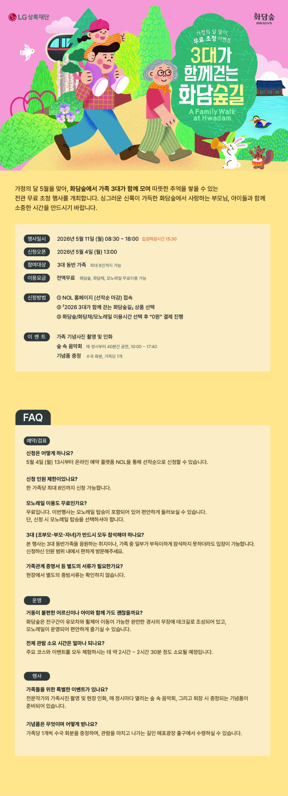 LG재단 » 활동소식 » 상록재단 » [화담숲] 3대가 함께 걷는 화담숲길 행사 안내 < 활동소식 목록보기 [화담숲] 3대가 함께 걷는 화담숲길 행사 안내 26.04.29 / 상록재단